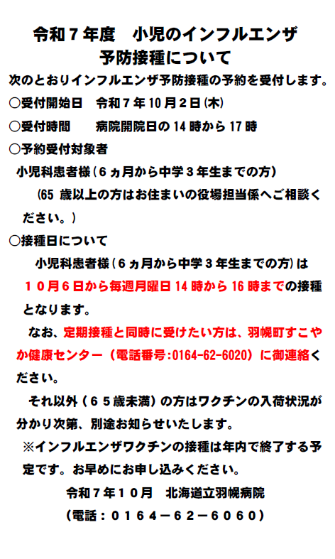 令和7年度 小児のインフルエンザ予防接種について