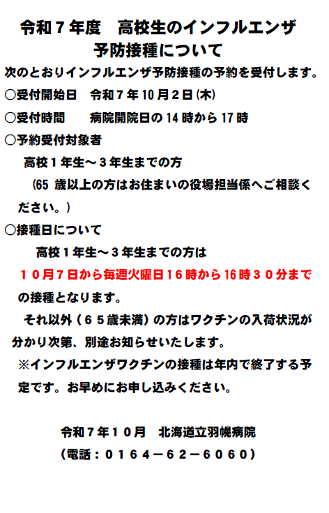 令和7年度 インフルエンザ予防接種について(高校生・小児)