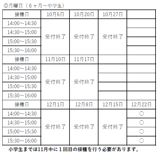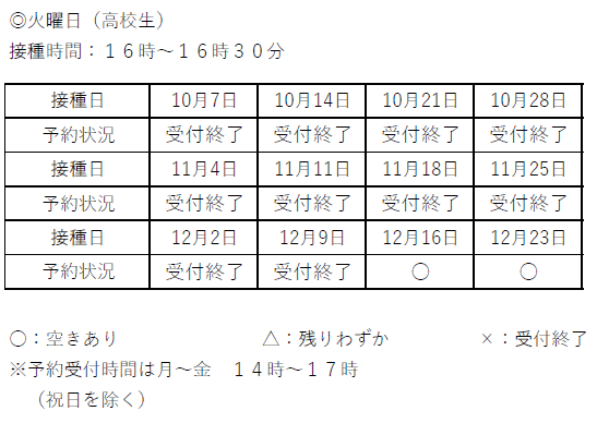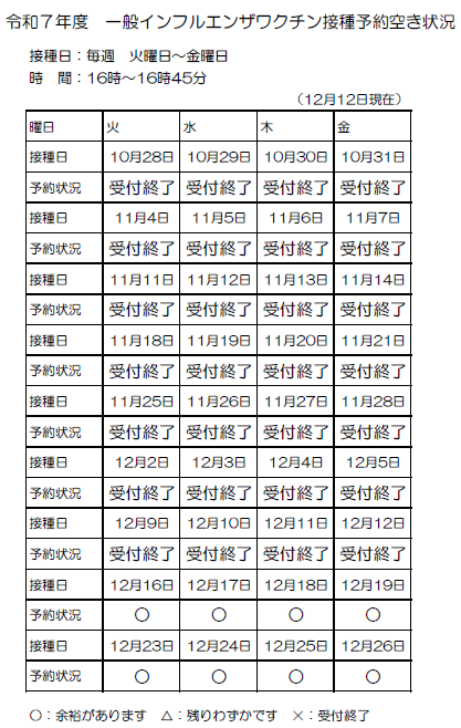 インフルエンザワクチン接種予約空き状況(12月12日現在)